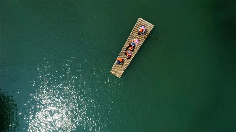 航拍下的潭瀑峽:竹筏水中流,游人畫中游,墨綠色的水面上靜謐如一幅美麗畫卷。
