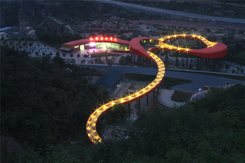 青年洞主入口標(biāo)志性建筑紅飄帶——廊橋,整體形態(tài)猶如山間舞動(dòng)的紅飄帶,是紅旗渠形態(tài)的延伸,紅旗渠精神的升華。集票務(wù)服務(wù)、購物、交通等功能為一體,在解決游客跨省道安全基本功能的同時(shí)建成了景區(qū)景觀工程。