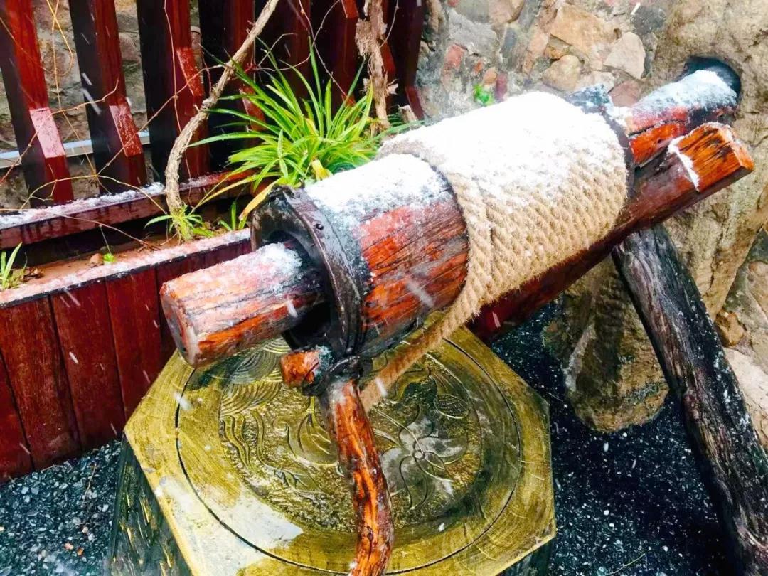 慢慢的,鋪滿青石磚的地面地面長出了白色的“絨毛”,薄薄的雪覆在樹干上,掩蓋了崢嶸的歲月。