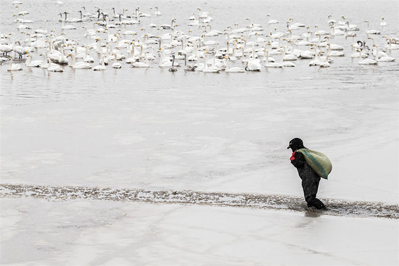 豈不知,為留住這些白天鵝,濕地保護(hù)工作人員付出了太多的艱辛。寒風(fēng)凜冽中,他們踏冰送糧,確保天鵝每天都能飽餐。