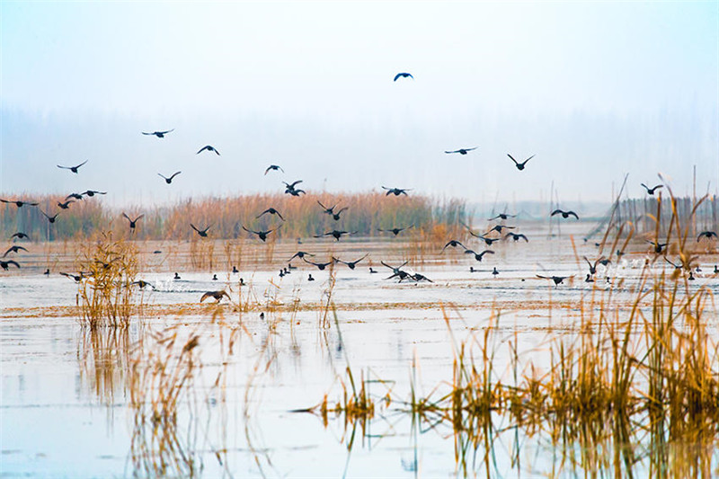 蘆葦深處鳥(niǎo)飛舞。(王天定文/圖)