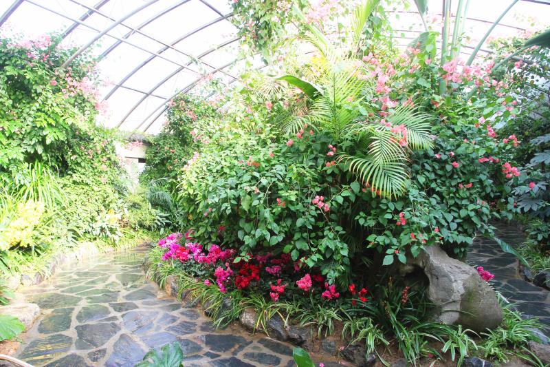 精心培育多年的三角梅花枝蔓延,爬滿溫室,淺紫深紅間搖曳一室春意融融,花間更有亭臺樓榭點(diǎn)綴其中,構(gòu)畫了“閬苑花開不夜春”的生態(tài)畫卷,讓市民群眾在新春佳節(jié)的觀花賞景中充分享受美好生活。