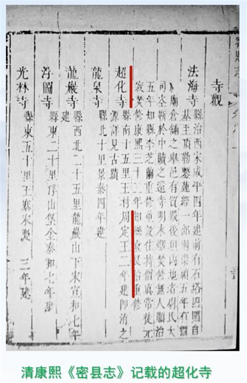 第三種說法是超化寺建于隋開皇元年(公元581年),此種記載最多。清順治十六年(1659)《密縣志·古跡·寺觀》記載:“超化寺:縣南王村保。隋開皇元年建。”清雍正六年(1728)《古今圖書集成·開封府部匯考十·祠廟考下寺觀附》:“超化寺:在縣南王村堡。隋開皇元年建。”隋開皇元年(581年)算起,距今有1442年歷史。