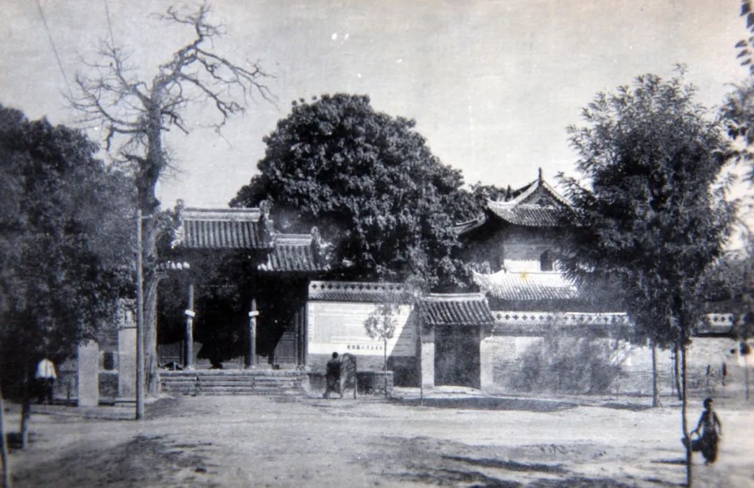 從這張照片不知在何時拍攝。太昊陵太極門雖然看起來破舊,倒沒有受到損壞;門前左右分別有三通石碑,特別是左邊內(nèi)側(cè)的石碑,高大而氣派,應(yīng)該屬于比較珍貴的文物;門前左側(cè)還有棵粗壯的側(cè)柏,雖已干枯,但英姿不減;在右下角還有個五、六歲左右的孩子,手里掂著一個柳條編織的筐,應(yīng)該是撿拾糞球。整個畫面靜謐而祥和,給人一種莊重肅穆且不失生活真實之氛圍。
