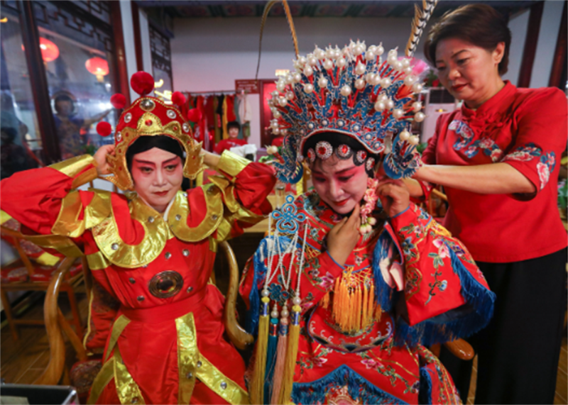 在鞏義市偃月古城戲曲廣場內(nèi),當(dāng)?shù)剞r(nóng)民演員正在后臺精心準(zhǔn)備。鞏義是藝術(shù)之鄉(xiāng),也是著名豫劇表演藝術(shù)家常香玉的故鄉(xiāng),戲曲愛好者眾多。河南日報客戶端記者 王錚 攝