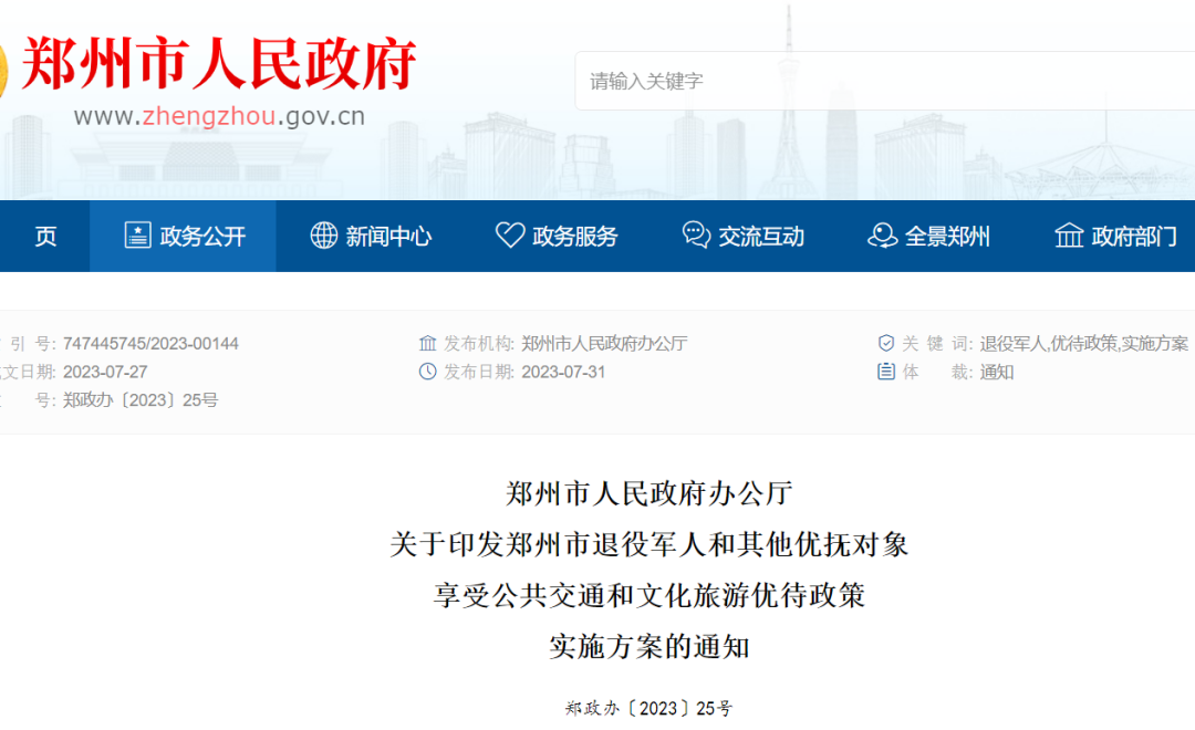 根據《鄭州市人民政府辦公廳關于印發(fā)鄭州市退役軍人和其他優(yōu)撫對象享受公共交通和文化旅游優(yōu)待政策實施方案的通知》要求,自2023年8月1日起,退役軍人及其他優(yōu)撫對象免費乘坐市區(qū)公交線路。