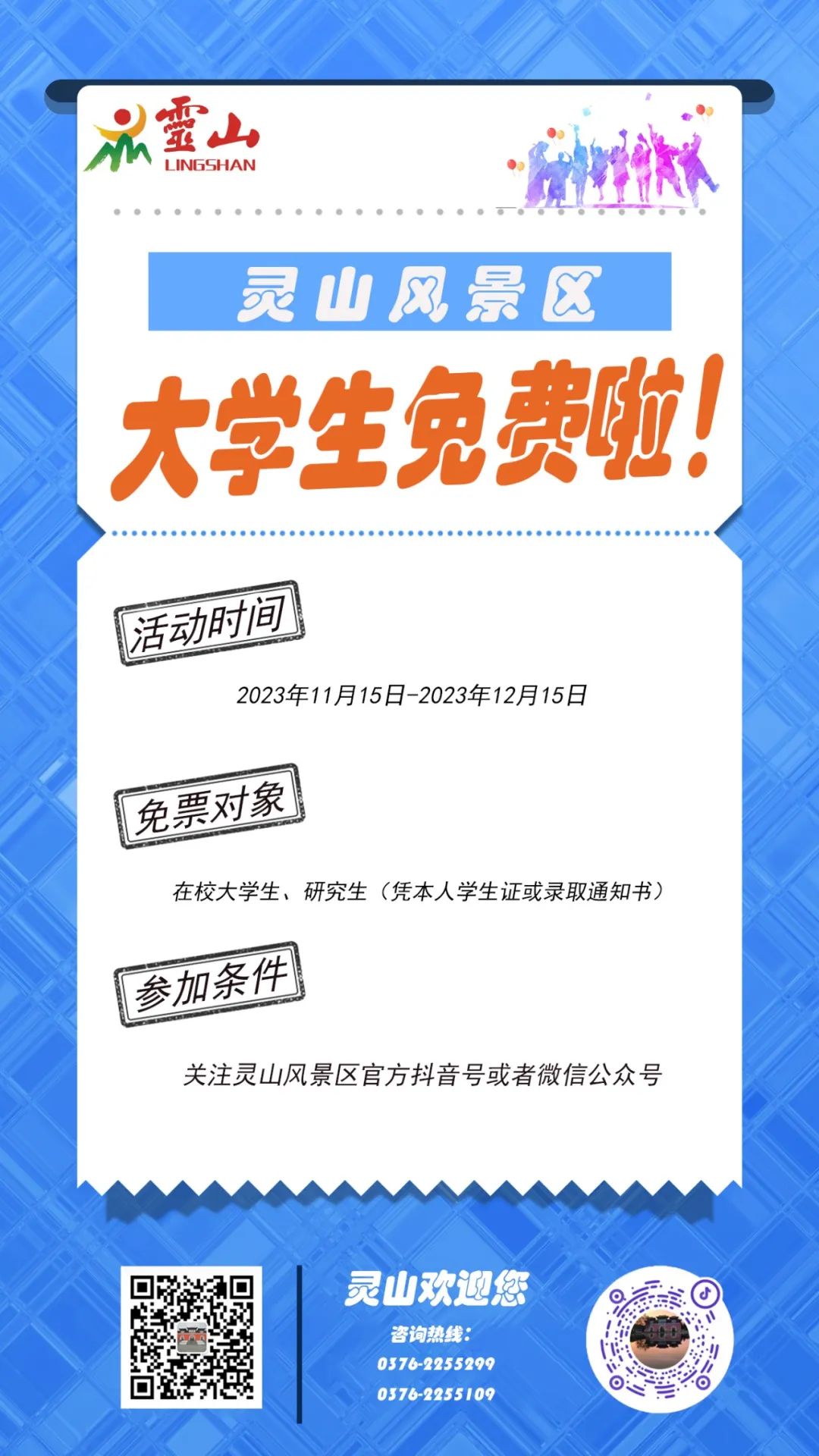 此次活動面向所有在校大學(xué)生,參加條件十分簡單。只需要關(guān)注景區(qū)的抖音官方賬號或者微信公眾號,即可享受免票游玩的優(yōu)惠。靈山風(fēng)景區(qū)希望通過這次活動,吸引更多的年輕人來到這里,感受大自然的魅力;顒泳唧w如下