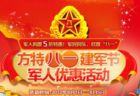 據(jù)悉,八一建軍節(jié)來臨之際,方特連鎖主題公園特別推出折扣感恩回饋軍人朋友,邀請全國軍人前往各地方特主題公園狂歡同慶。