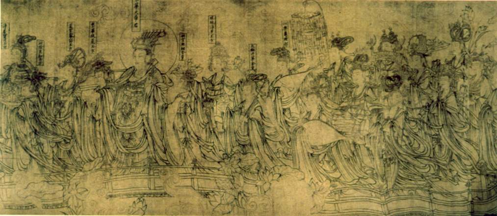 今存《朝元仙仗圖》,絹本,墨筆畫,美國(guó)華人王季遷藏。畫道教?hào)|華、南極兩天帝率領(lǐng)仙官、侍從和儀仗隊(duì)去朝拜玄元皇帝的情形。天下三界十方男子得道成仙由東華帝君統(tǒng)管,南極天帝則統(tǒng)管人類的壽命,玄元皇帝即老子。