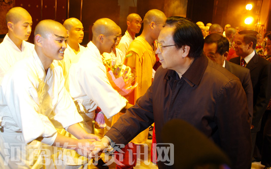 演出結(jié)束后,徐光春等走上舞臺,親切接見全體演職人員并祝賀演出成功。徐光春說,河南具有非常豐富的文化資源,這兩年,我們到上海、天津和港澳等地開展“中原文化行”,宣傳了河南文化,提升了河南形象,取得了豐碩成果!渡倭治浠辍肪褪窃p方發(fā)揮各自優(yōu)勢,聯(lián)袂打造的一個文化平臺,創(chuàng)新了功夫劇的表現(xiàn)形式,弘揚了社會正義,展示了人性中的美好情懷,既促進了文化產(chǎn)業(yè)的發(fā)展,又促進了旅游產(chǎn)業(yè)的發(fā)展。特別是《少林武魂》進行的藝術(shù)創(chuàng)新,符合藝術(shù)自身的規(guī)律,符合演藝產(chǎn)業(yè)發(fā)展的需要,希望大家進一步總結(jié)提高,使之成為深受人民喜愛的優(yōu)秀作品,成為宣傳河南的又一大亮點。