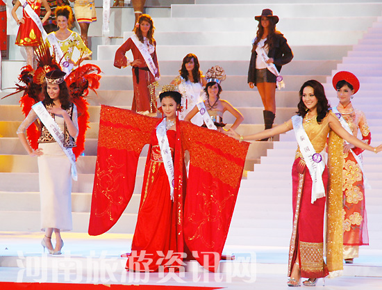 昨晚8時,隨著《大河·青銅》歌舞表演閃亮登場,2007國際旅游小姐冠軍總決賽晚會在鄭州國際會展中心精彩啟幕。大賽決出了前3名及五大洲最佳旅游小姐,俄羅斯佳麗、泰國佳麗、費爾南多·迪諾羅尼亞佳麗分獲冠、亞、季軍,冠軍獲得“世界旅游皇后”稱號。 本臺晚會由河南衛(wèi)視和澳亞衛(wèi)視聯手向全球直播。晚會期間,108位佳麗表演了精彩的“民族服裝秀”、“旗袍秀”、“晚裝秀”、“泳裝秀”,并穿插進行了“十強知識問答”、“最佳才藝小姐才藝表演”等。在佳麗們盡現婷婷倩影及高超才藝之余,少林功夫、太極拳等頗具中原特色的精湛表演將晚會一次次推向高潮。 晚會期間,主辦方還為“最佳微笑小姐”、“最高貴小姐”等14個單項獎舉行頒獎儀式?倹Q賽現場還評出了五大洲最佳旅游小姐及前10強和前5名。