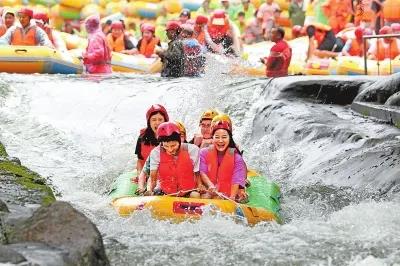 游客在位于魯山縣堯山鎮(zhèn)的河南堯山大峽谷漂流景區(qū)漂流納涼。
