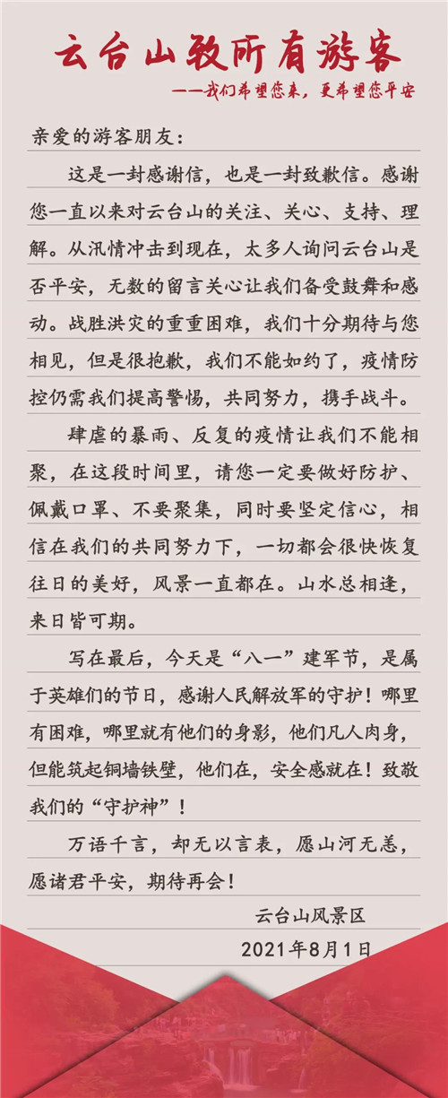 云臺(tái)山致所有游客:我們希望您來,更希望您平安