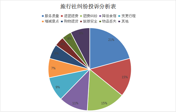 投訴旅行社53件,其中服務(wù)質(zhì)量糾紛11件,退團(tuán)退費(fèi)糾紛8件,團(tuán)費(fèi)糾紛8件,降低食宿糾紛6件,變更行程糾紛5件,增減景點(diǎn)糾紛4件,購物退貨糾紛3件,旅游安全糾紛2件,物品丟失糾紛2件,其他糾紛4件。