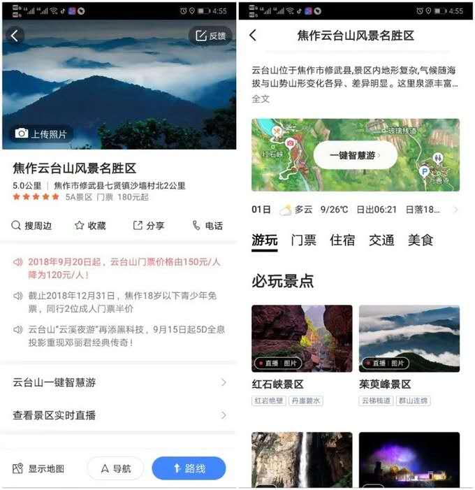 今年以來, 云臺山 景區(qū)與高德地圖打造的“智能 云臺山 ”上線,為游客提供游前、游中、游后,景區(qū)外+景區(qū)內一站式、全方位服務。十一假期到來,“智能 云臺山 ”發(fā)揮了巨大的作用。游覽前,游客在高德地圖搜索 云臺山 ,可一鍵直達“景區(qū)門戶”,不僅能查詢交通,還可以在線購票、訂酒店、查看景區(qū)最新動態(tài);游覽中,游客點擊“一鍵智慧游”,進入 云臺山 手繪導覽圖,不需要再尋人問路,就可以找到多種個性化游覽線路、明星語音導游、停車場、乘車點、最佳拍照點、廁所、醫(yī)務室、餐廳等等,發(fā)生緊急情況可點擊“一鍵呼救”,快速尋求景區(qū)管理員幫助;游覽結束后,游客可針對景區(qū)發(fā)表游記和評論,供更多游客參閱。同時,“智能 云臺山 ”管理系統(tǒng),可及時了解景區(qū)周邊高速、省道路況信息,協(xié)調交警做好景區(qū)外圍交通管制與疏導;24小時監(jiān)控全方位覆蓋景區(qū),及時應對各種突發(fā)事件。