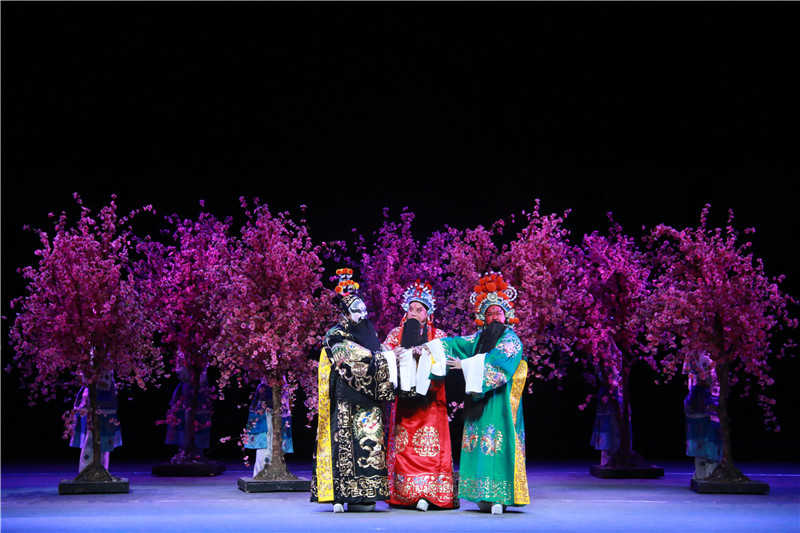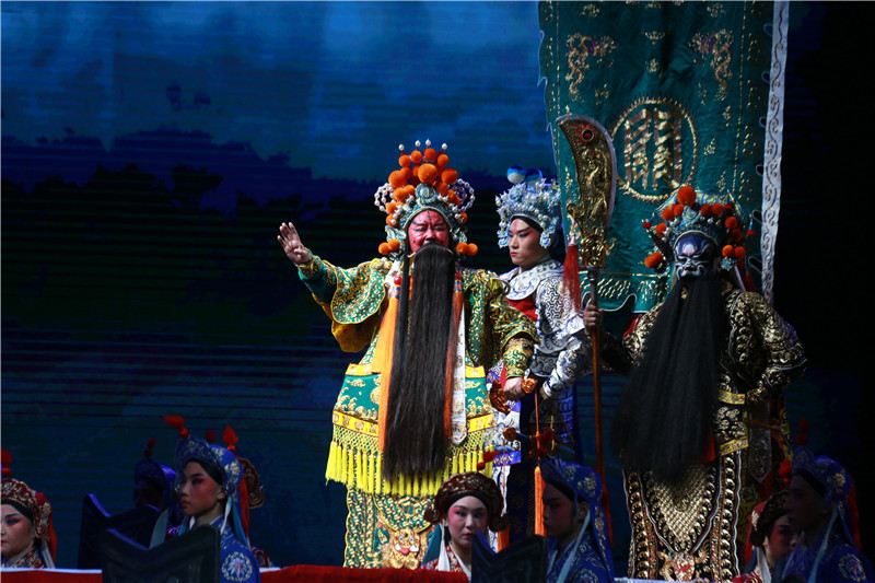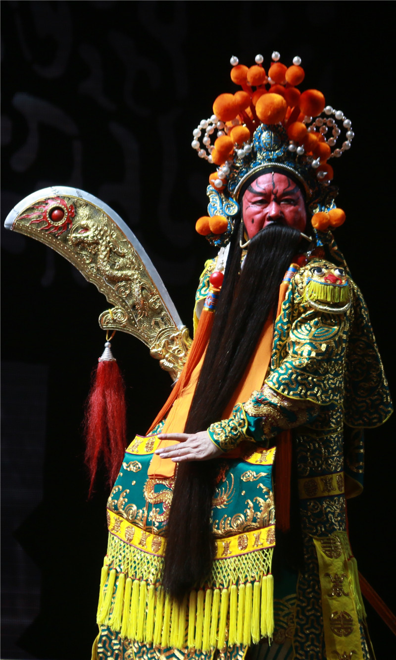 大幕開(kāi)啟,劉關(guān)張?zhí)覉@三結(jié)義。舞臺(tái)之上,從桃園三結(jié)義的對(duì)天盟誓,到火燒赤壁時(shí)的萬(wàn)箭齊發(fā);從美不勝收的舞臺(tái)設(shè)計(jì)、恢宏的多媒體技術(shù)、精美華麗的戲曲服裝,到激昂動(dòng)聽(tīng)的作曲唱腔……一幕幕精彩場(chǎng)景在喝彩聲中震撼上演。表演時(shí),在關(guān)羽辭別曹操即將投奔劉備一幕,李樹(shù)建飾演的關(guān)公,面對(duì)曹操贈(zèng)馬前送錦袍,他用手中的青龍偃月刀挑起袍子,在空中劃出圓弧,衣服瀟灑地飄落至身旁藍(lán)衣馬童手中,這精彩的一幕,贏得了臺(tái)下雷鳴般的掌聲。