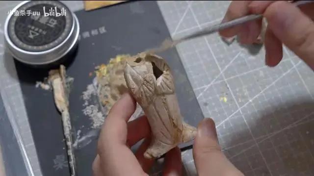將碎片從泥里一一掏出并清洗完畢后,該Up主按照說明書的指點,將附贈的修復工具石膏粉、白乳膠和金粉混合,調出了一攤“金泥”,還自己另外加入了一點夜光涂料,并特意用鑷子掰掉了陶片的一角,在仕女俑的胸口位置留出一個小洞。