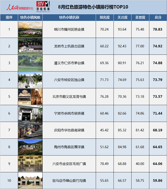 人民網(wǎng)輿情數(shù)據(jù)中心與北京電視臺京視傳媒聯(lián)合發(fā)布的“8月紅色旅游特色小鎮(zhèn)排行榜TOP10”,以住建部公布的403個“國家級特色小鎮(zhèn)”為篩選對象,從各個紅色旅游特色小鎮(zhèn)的名度、關(guān)注度及美譽度三個維度出發(fā),通過海量數(shù)據(jù)分析和數(shù)理模型計算,呈現(xiàn)紅色旅游特色小鎮(zhèn)的綜合影響力,為游客提供出行必要參考。