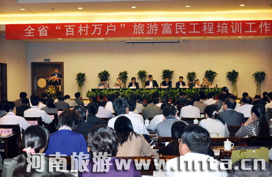 9月26日,全省“百村萬戶”旅游富民工程培訓(xùn)工作會議在平頂山魯山縣召開。省旅游局局長蘇福功,副局長倪豫州,平頂山市委常委、副市長王麗,來自全省18個省轄市旅游局代表,46個縣(市、區(qū))旅游局有關(guān)領(lǐng)導(dǎo),鄉(xiāng)村旅游村鎮(zhèn)代表參加了會議。
