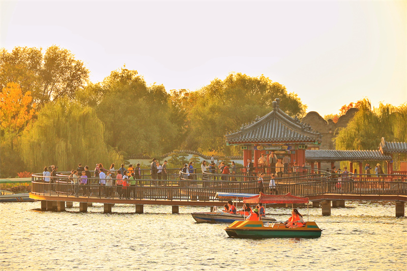 10月29日,在暖陽的映襯下,鐵塔公園景色優(yōu)美,游客在這里游玩賞菊,很是愜意。開封+記者 李浩 攝