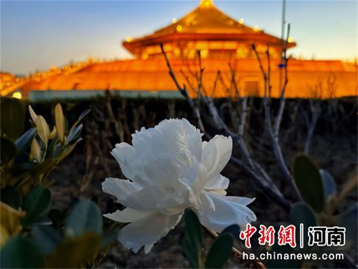 白色的牡丹,金碧輝煌的明堂,相映成輝。朱澤南 攝