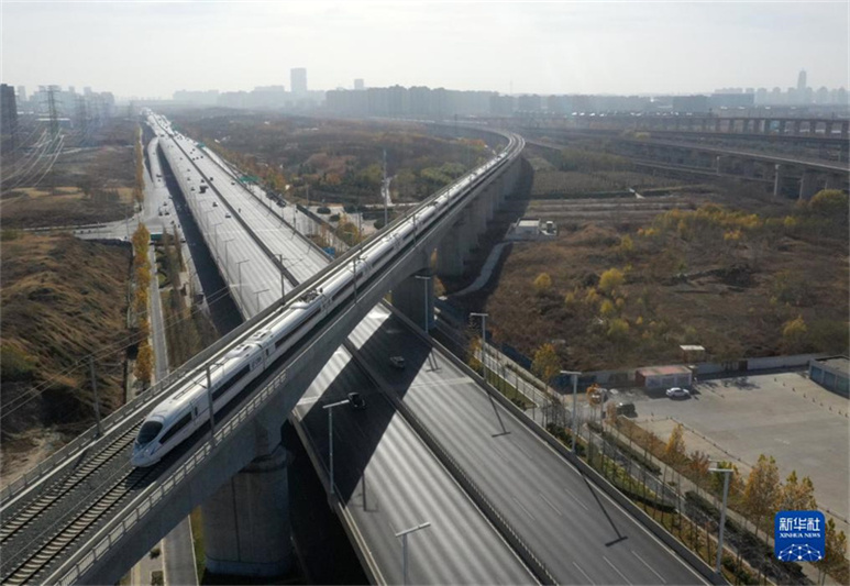 12月8日,在鄭州市東三環(huán)附近,列車(chē)行駛在濟(jì)鄭高速鐵路上(無(wú)人機(jī)照片)。12月8日,濟(jì)鄭高鐵全線貫通運(yùn)營(yíng)。濟(jì)鄭高鐵是國(guó)家“八縱八橫”高鐵網(wǎng)的重要連接線,是山東省“八縱六橫”高鐵網(wǎng)的西向出省通道,也是河南“米”字形高鐵網(wǎng)的最后一“筆”。項(xiàng)目通車(chē)后,魯豫兩省實(shí)現(xiàn)高鐵直通,鄭州東站至濟(jì)南西站間最快1小時(shí)43分鐘可達(dá)。新華社記者 李嘉南 攝