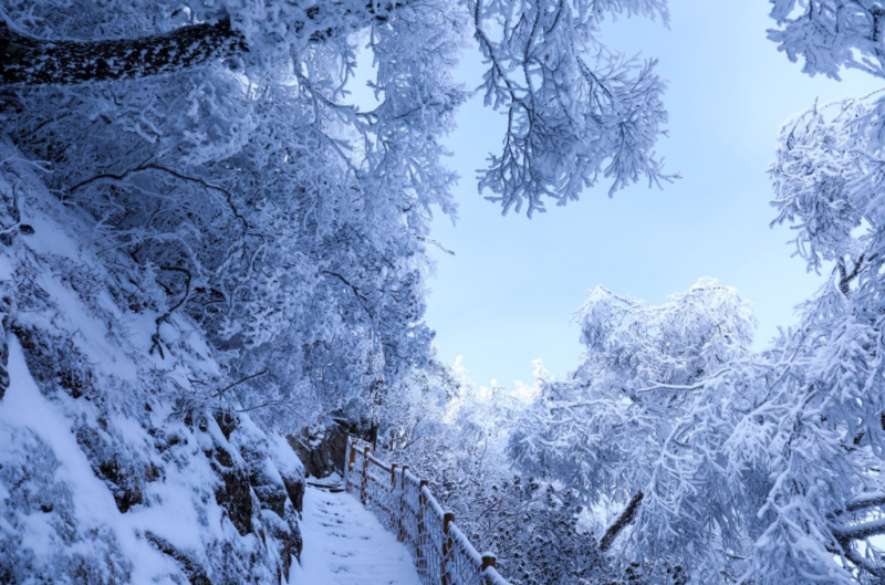 大雪洗禮后的白云山搖身變成銀色的世界,漫山霧淞、冰掛、雪色組成人間仙境的盛景。