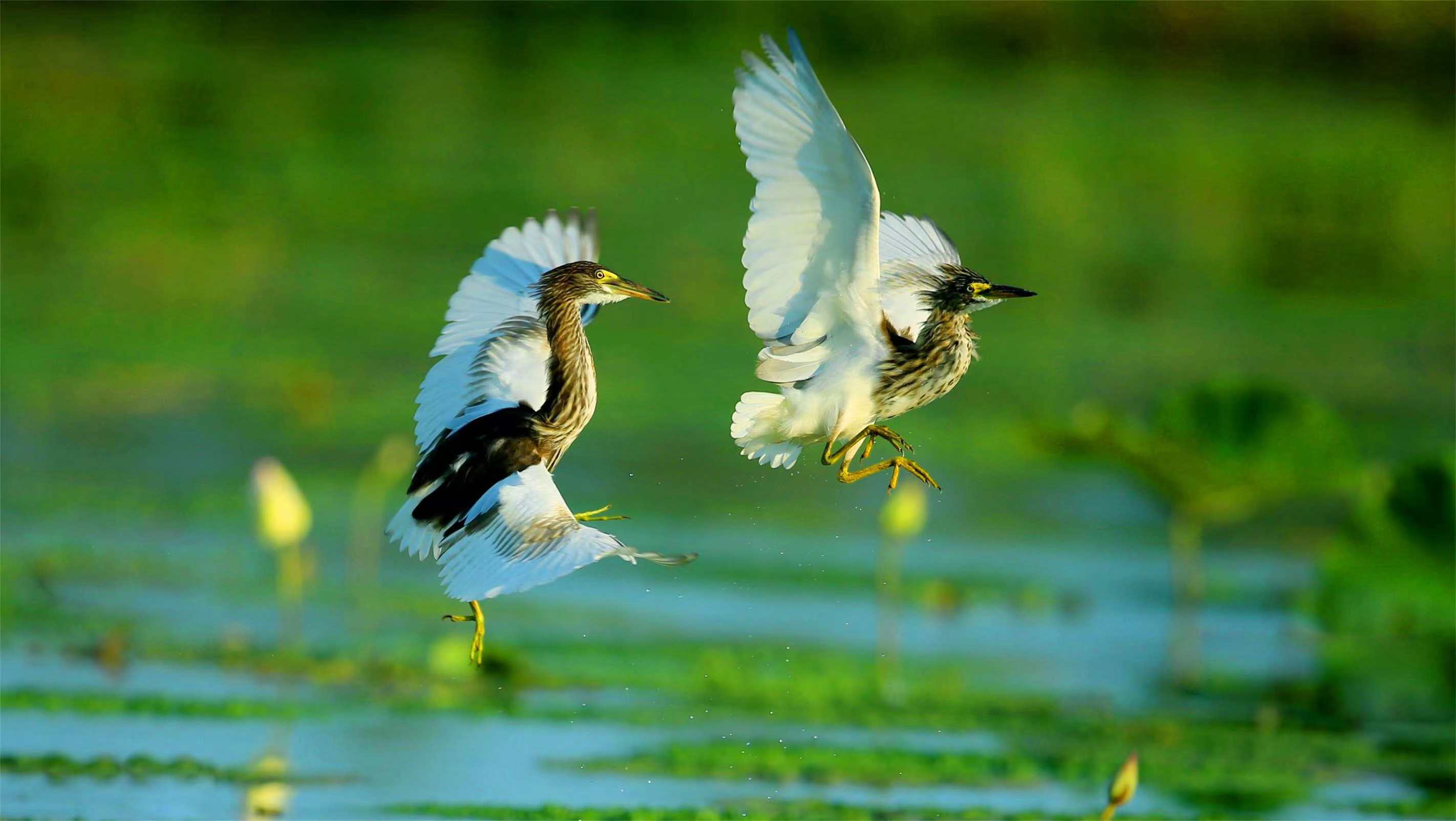 位于河南省信陽市淮濱縣的淮南濕地省級自然保護區(qū)方家湖畔牛旦灣,密布的湖泊水網(wǎng),滋潤著茂密的水草林木、豐美的魚蝦螺蚌,更養(yǎng)育了萬千濕地精靈。在這里,可觀賞鳥兒求偶、交配、育雛、覓食、打斗,這里被稱為煙雨江南、夢里水鄉(xiāng)、鳥類樂園。