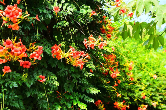 盛夏時(shí)節(jié),駐馬店市泌陽縣銅山湖大道游園里,紫薇花、凌霄花、木槿花、百日菊等各色花兒爭相盛開,行走其間如同置身于花海。