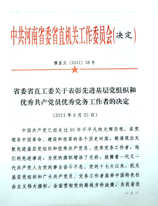 省委省直工委關(guān)于表彰先進(jìn)基層黨組織和優(yōu)秀黨務(wù)工作者的決定