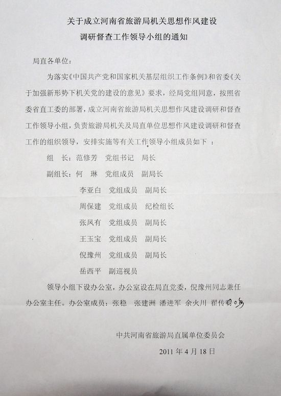 關于成立河南省旅游局機關思想作風建設調研督查工作領導小組的通知